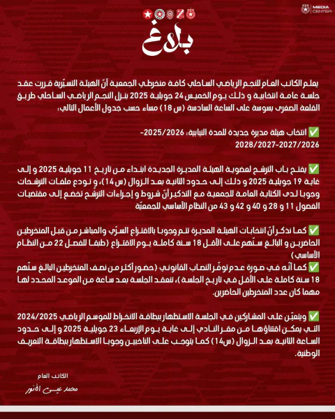رياضة: اعلن الكاتب العام للنجم الرياضي الساحلي كافة منخرطي الجمعية أنّ الهيئة التسيّرية قررت عقد جلسة عامة انتخابية و ذلك يوم الخميس 24 جويلية 2025 بنزل النجم الرياضي الساحلي طريق القلعة الصغرى بسوسة على الساعة السادسة