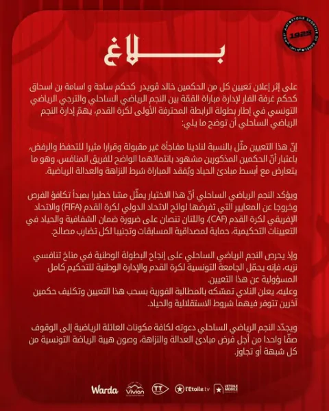 رياضة: أصدر النجم الساحلي بلاغًا عبر صفحته الرسمية، أعلن فيه رفضه تعيين الحكم خالد ڨويدر كحكم ساحة وأسامة بن إسحاق كحكم غرفة “الفار” في مباراة القمة أمام الترجي الرياضي التونسي الأحد القادم في إطار الجولة 9 لبطولة الرابطة المحترفة الأولى