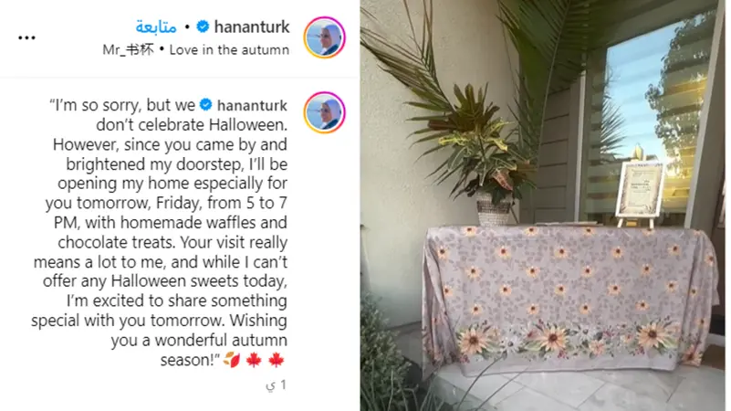 لفتت الفنانة المصرية المعتزلة حنان ترك الأنظار خلال احتفالات “الهالوين“ في الولايات المتحدة، وذلك بعد أن تركت رسالة على باب منزلها هناك وجهتها لجيرانها المحتفلين بهذه المناسبة.