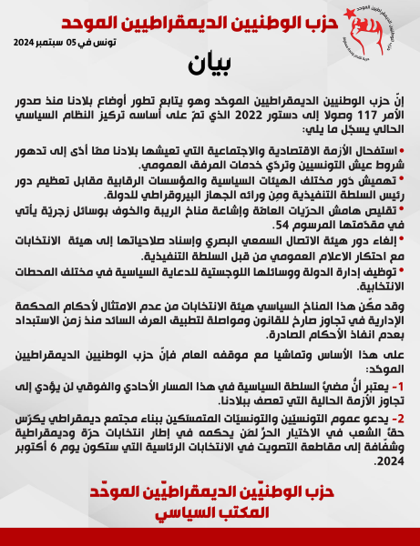 صدر حزب الوطنيين الديمقراطيين الموحّد - الوطد- بيانا قال فيه انه " يتابع تطور أوضاع بلادنا منذ صدور الأمر 117 وصولا إلى دستور 2022