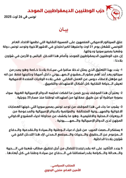 سياسة: ندد حزب الوطنيين الديمقراطيين - الوطد- بتعليق "السيناتور الامريكي المتصهين على المسيرة النقابية التي نظمها الاتحاد العام التونسي للشغل يوم 21 اوت واعتبرها اكبر احتجاج في الاشهر الأخيرة وتوعد تونس دولة وشعبا بمصير سوريا ودولته".