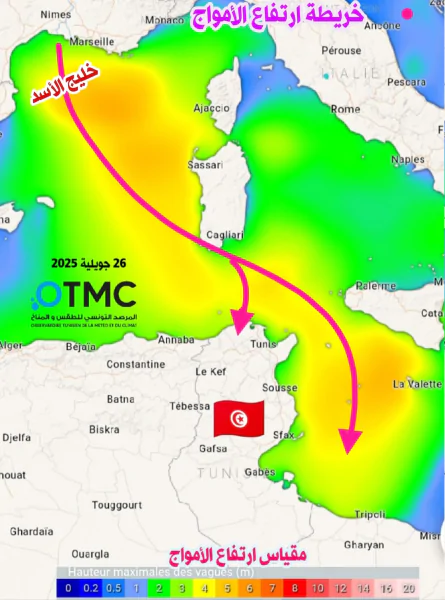 واشار المرصد الى وجود رياح قوية نازلة من خليج الأسد تتجاوز سرعتها أحيانا 60 و 70 و 80 كم/س في شكل هبات، والى ان ارتفاع الأمواج سيتجاوز أحيانا 2 و 3 متر قرب السواحل، وسيصل الارتفاع الأقصى للأمواج أحيانا 4 متر في عرض البحر المتوسط بين تونس وايطاليا و بين تونس وفرنسا.