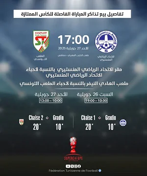 رياضة: أعلنت الجامعة التونسية لكرة القدم عن تفاصيل بيع تذاكر المباراة الفاصلة للكأس الممتازة، التي ستجمع بين الاتحاد الرياضي المنستيري والملعب التونسي يوم الأحد 27 جويلية 2025 على أرضية ملعب الطيب المهيري بصفاقس بداية من الساعة الخامسة مساءً.