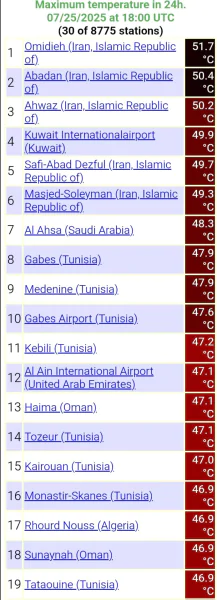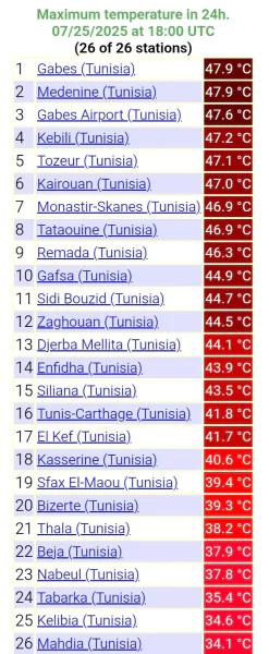 وطنية: كشف المرصد التونسي للمناخ والطقس أن تونس احتلت8 مراتب ضمن 20 محطة الأسخن في العالم قراءة المزيد كشف المرصد التونسي للمناخ والطقس أن تونس احتلت8 مراتب ضمن 20 محطة الأسخن في العالم و احتلت قابس و مدنين المرتبة 8 في العالم، كما ضمت القائمة المنستير و القيروان و تطاوين وقبلي و توزروبلغا درجات الحرارة القصوىالمسجلة اليوم الجمعة 25 جويلية 2025،48° في مدنين و قابس 47° وفي القيروان والمنستير وتوزر وقبلي وتطاوينمدرب قطر يطالب الفيفا بالتحقيق في مباراة تونس وفلسطينتونس تدعو الدول للوقوف أمام خرق الكيان الصهيوني للقانون الدوليبالأرقام.. عدد جرائم قتل النساء في تونس والجزائر والمغربالمزيد من الأخبار