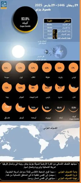 وهذا الكسوف الجزئي يشمل النصف الشمالي من الكرة الأرضية يمكن رؤيته في شمال أفريقيا وأمريكا الشمالية وأوروبا وشمال آسيا وذلك يوم السبت 29 مارس 2025 الموافق لـ 29 رمضان 1446 هـ.