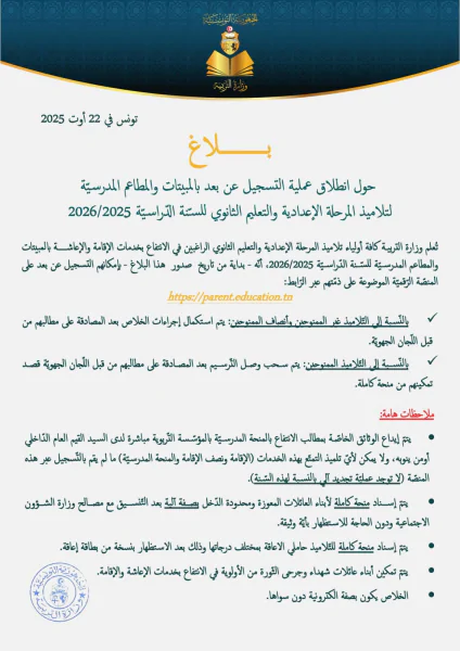 وطنية: أعلنت وزارة التربية في بلاغ لها الجمعة 22 أوت 2025، أن بإمكان كافة أولياء تلاميذ المرحلة الإعدادية والتعليم الثانوي الراغبين في الانتفاع بخدمات الإقامة والإعاشة بالمبيتات والمطاعم المدرسية للسنة الدراسية 2026/2025 التسجيل عن بعد بداية من اليوم على المنصة الرقمية الموضوعة على ذمتهم
