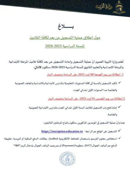 وانطلاقا من يوم الجمعة 8 أوت يبدأ التسجيبل بالنسبة لكافة المستويات التعليمية بالمدارس الابتدائية الإعدادية والثانوية ما عدا السنوات الأولى ابتدائي الجددّ.