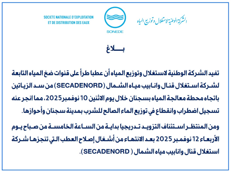 وطنية: أعلنت الشركة الوطنية لاستغلال وتوزيع المياه (SONEDE) عن تسجيل اضطراب وانقطاع في توزيع المياه الصالحة للشرب بمدينة سجنان وضواحيها يوم الإثنين 10 نوفمبر 2025.