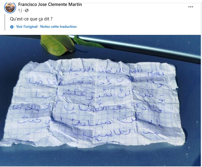 وعثر الناشط الإسباني فرانشيسكو خوسيه كليمونت مارتين، الذي يعمل في مركز استقبال المهاجرين غير الشرعيين، على الورقة في ملابس أحد المتوفين، ونشرها على صفحته في موقع “فيسبوك”، مناشدا متابعيه أن يترجموا له محتواها.