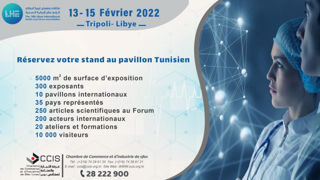 تواصل غرفة التجارة والصناعة لصفاقس مساهمتها في تنشيط العلاقات الاقتصادية بين تونس وليبيا وحرصها على خلق فرص جديدة للاستثمار والشراكة بين البلدين، وذلك من خلال تنظيم المشاركة التونسية في “ملتقى ومعرض ليبيا الدولي الرابع عشر للرعاية الصحية” الذي سيلتئم من 13 إلى 15 فيفري 2022 بمعرض طرابلس الدولي.