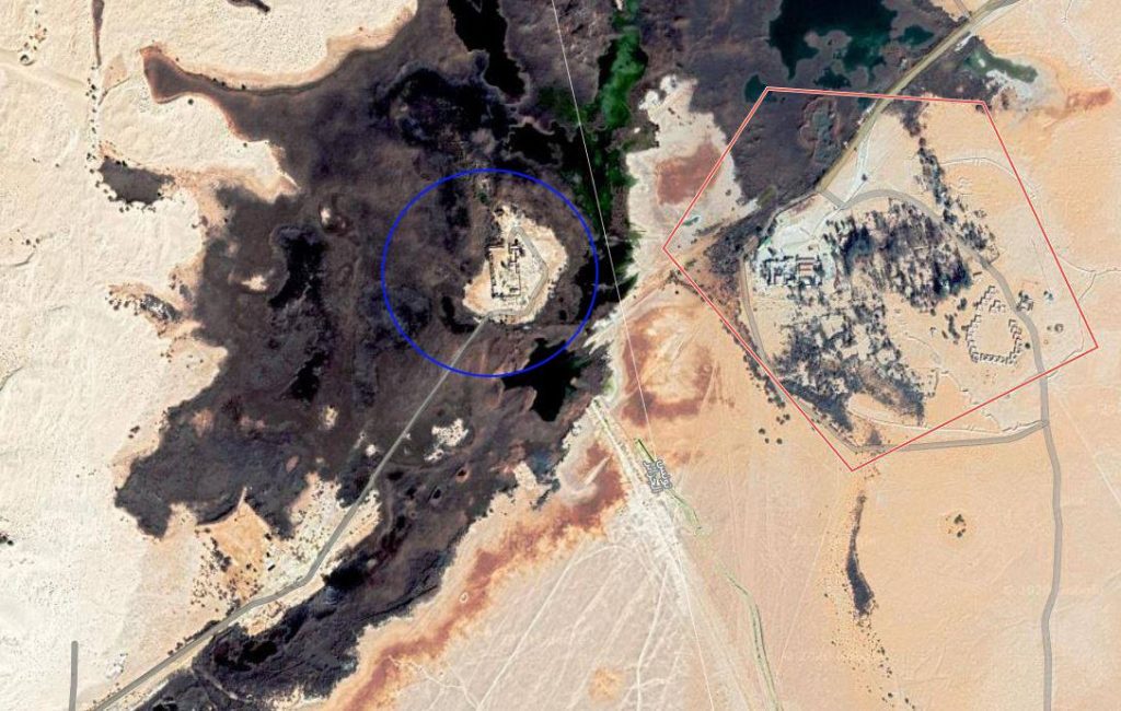 الخط الأحمر الذي أضفناه للخريطة يمثل الحدّ الفاصل بين تونس والجزائر، ويبدو الجزء الأكبر من البقعة السوداء في الجانب الجزائري من الحدود، حيث قد يكون منبع التسرّب من هناك. وبالتثبت أكثر من الموقع بعد تقريب الصورة اتضح وجود مستطيل يبدو كمنشأة بترولية جزائرية تنتهي إليها طريق قادمة من الجنوب الجزائريّ، ولا تتواصل بعدها.