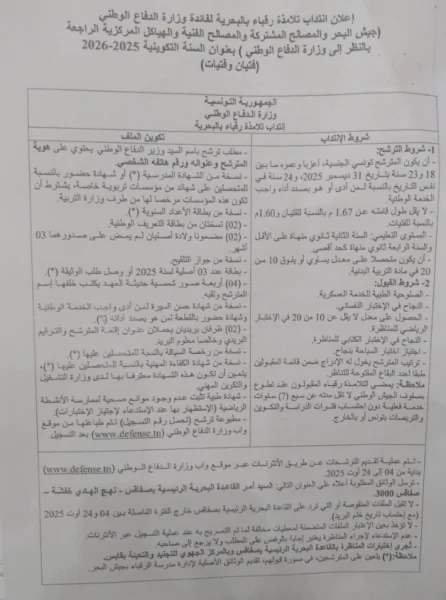 تفتح وزارة الدفاع الوطني بداية من اليوم الإثنين 4 أوت 2025، باب تقديم الترشحات لانتداب تلامذة رقباء بالبحرية لفائدتها بعنوان السنة التكوينية 2025-2026.