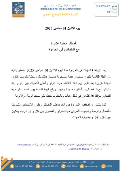 أعلن المعهد الوطني للرصد الجوي أنّ طقس الاثنين 01 سبتمبر 2025 سيشهد تغيّرات هامة، حيث من المتوقع نزول أمطار محليًا غزيرة بالشمال وأحيانًا بالوسط بداية من الليلة، مع انخفاض ملحوظ في درجات الحرارة بالبلاد التونسية.