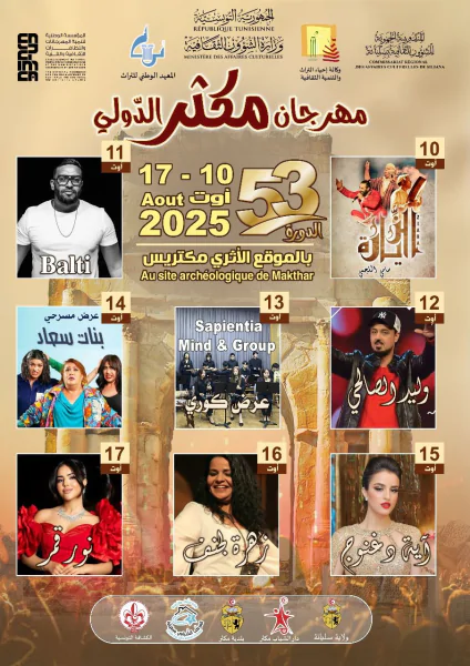 تنطلق فعاليات الدورة 53 لمهرجان مكثر الدولي من 10 إلى 17 أوت 2025، وفق ما نشرته المندوبية الجهوية للشؤون الثقافية بسليانة