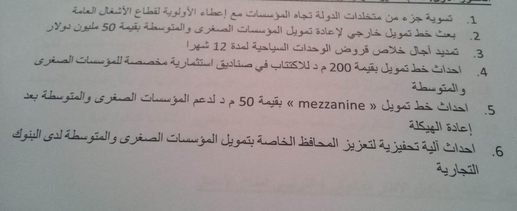 تضمنت مصفوفة الاجراءات العاجلة للبرنامج الحكومي لتنشيط الاقتصاد 8 إجراءات لدعم السيولة وتيسير نفاذ المؤسسات إلى التمويل.
