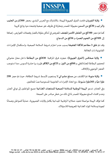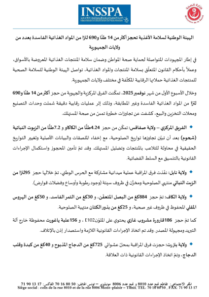 وطنية: تمكّنت الفرق المركزية والجهوية من حجز أكثر من 14 طنًا و690 لترًا من المواد الغذائية الفاسدة وغير المطابقة، وذلك إثر عمليات رقابية دقيقة شملت وحدات التصنيع ومحلات التخزين والبيع، كشفت عن تجاوزات خطيرة تمسّ من صحة المستهلك.