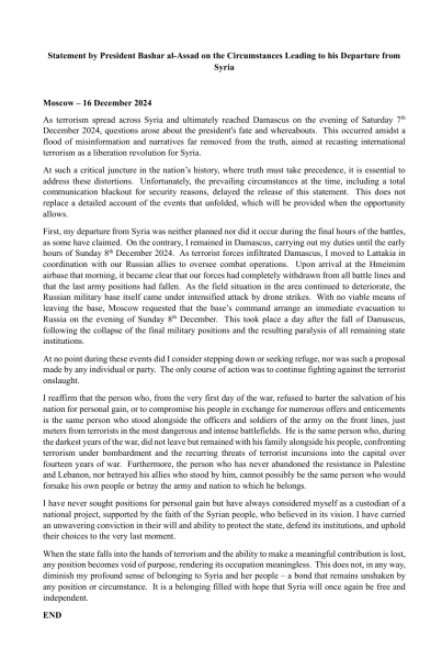 “مع تمدد الإرهاب في سورية، ووصوله العاصمة دمشق مساء السبت 7 كانون الأول 2024 بدأت الأسئلة تطرح عن مصير الرئيس ومكانه، وسط سيل من اللغط والروايات البعيدة عن الحقيقة وبما شكل إسناداً لعملية تنصيب الإرهاب الدولي ثورة تحرر السورية. في لحظة تاريخية فارقة من عمر الوطن ينبغي أن يكون فيها للحقيقة مكان، فإن ثمة ما يستدعي توضيحه عبر بيان مقتضب، لم تسمح تلك الظروف وما تلاها من انقطاع تام للتواصل لأسباب أمنية بالإدلاء به، والذي لا يغني بنقاطه المختصرة عن سرد تفاصيل كل ما جرى لاحقاً، حين تسنح الفرصة. بداية.. لم أغادر الوطن بشكل مخطط له كما أشيع، كما أنني لم أغادره خلال الساعات الأخيرة من المعارك، بل بقيت في دمشق أتابع مسؤولياتي حتى ساعات الصباح الأولى من يوم الأحد 8 ديسمبر 2024.