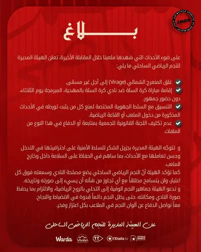 نشرت إدارة النجم الساحلي عبر صفحتها الرسمية على فيسبوك بلاغاً أفادت فيه أنّه تقرّر غلق مدارج المنعرج الجنوبي "فيراج" إلى أجل غير مسمّى