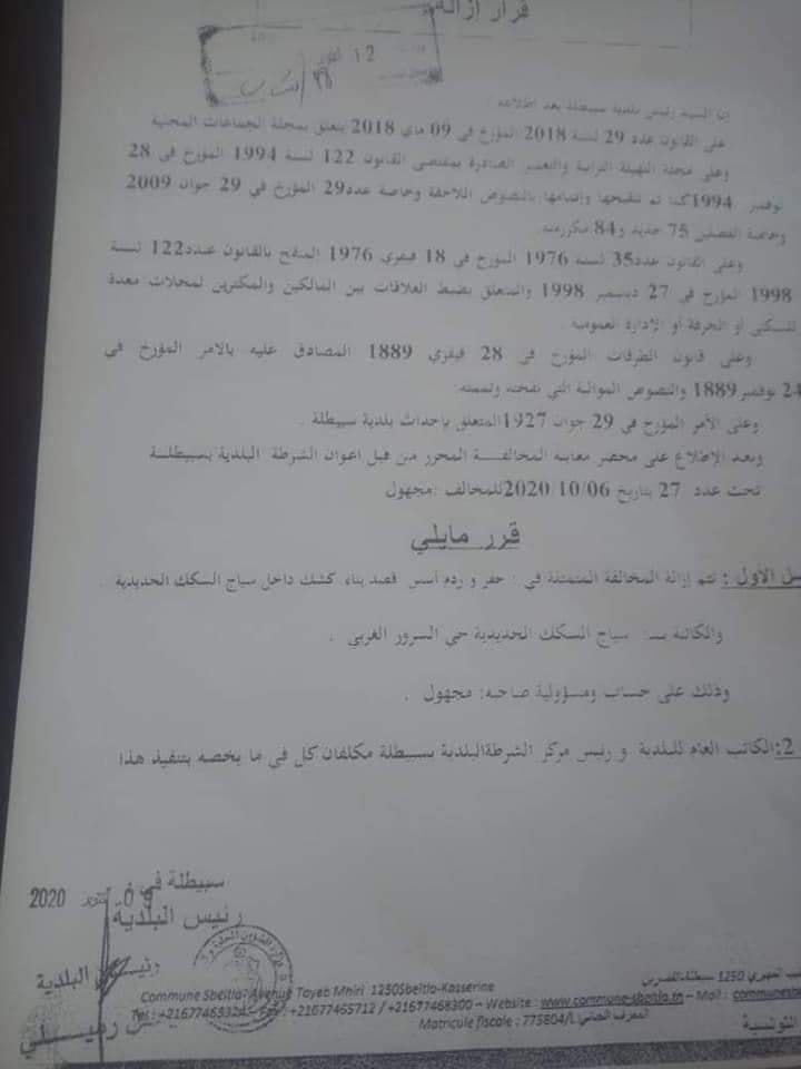 بعد نفيه علمه بقرار الهدم / تسريب وثيقة تورط رئيس بلدية سبيطلة (وثيقة)