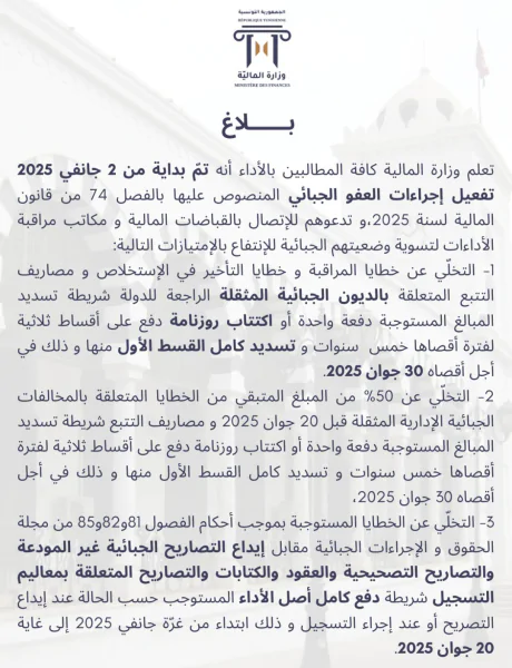 أصدرت وزارة المالية، اليوم الجمعة 3 جانفي 2025، بلاغا تعلم من خلاله كافة المطالبين بالأداء أنه تم بداية من 2 جانفي 2025 تفعيل إجراءات العفو الجبائي المنصوص عليها في قانون مالية 2025.