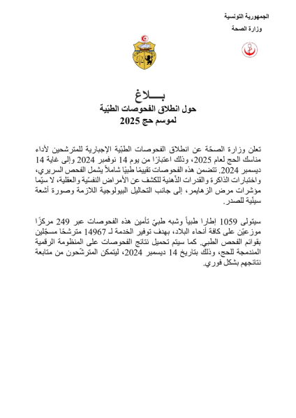 وطنية: اعلنت وزارة الصحة عن انطلاق الفحوصات الطبية الاجبارية للمترشحين لاداء مناسك الحج لعام 2025 اعتبارا من يوم 14 نوفمبر الى غاية 14 ديسمبر
