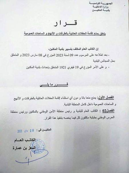 قررت بلدية المكنين التابعة لولاية المنستير، منع إقامة الحفلات العائلية […] قراءة المزيد قررت بلدية المكنين التابعة لولاية المنستير، منع إقامة الحفلات العائلية بالطرقات والأنهج و الساحات العمومية داخل كامل المنطقة البلدية.