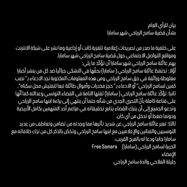 نشرت عائلة سامح الرياحي مغني الراب المعروف بسامار بيانا موجه الى الرأي العام قالت فيه انها ستحتفظ بحقها في تتبع كل من يروج اخبارا زائفة عن ابنها