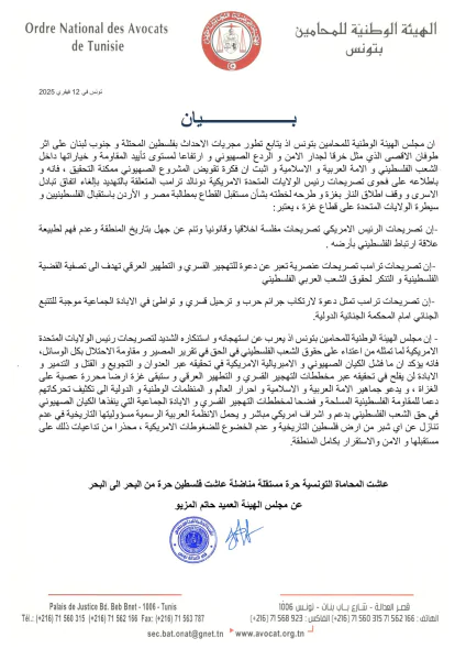 عبّرمجلس الهيئة الوطنية للمحامين بتونس، عن “استهجانه واستنكاره الشديد” تصريحات الرئيس الأمريكي “دونالد ترامب” التي هدد فيها بإلغاء اتفاق تبادل الأسرى ووقف إطلاق النار في قطاع غزة وطرحه لخطته بشأن مستقبل القطاع بمطالبة مصر والأردن باستقبال الفلسطينيين وسيطرة الولايات المتحدة على غزة.