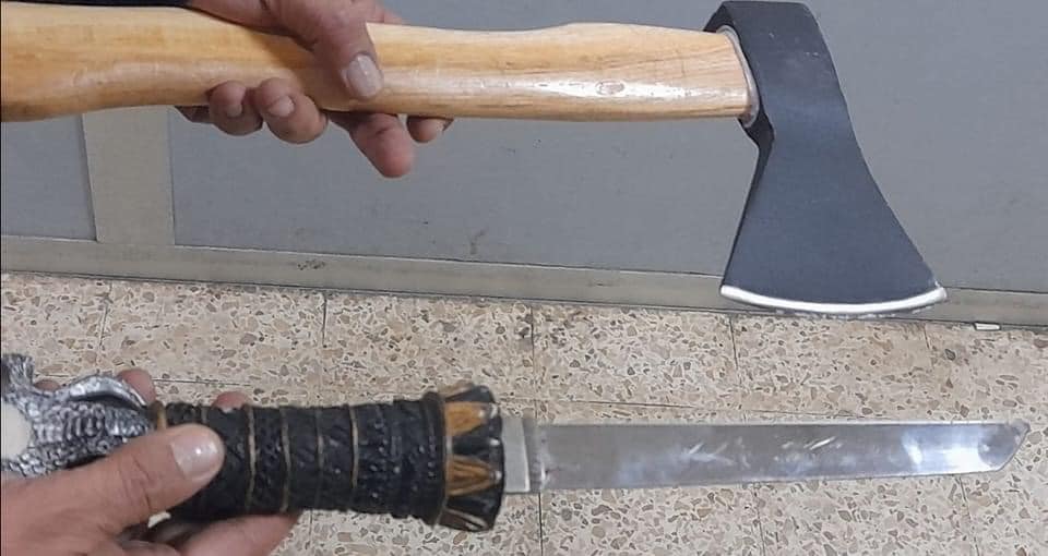 ونشرت الصفحة الرسمية لنقابة إقليم الأمن الوطني بتونس صورا لما تم حجزه لدى الشخص الذي حاول قتل أمنيين.