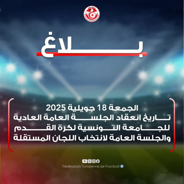 رياضة: اعلنت الجامعة التونسية لكرة القدم أن انعقاد الجلسة العامة العادية للجامعة التونسية لكرة القدم والجلسة العامة لانتخاب اللجان المستقلة سيكون قراءة المزيد اعلنت الجامعة التونسية لكرة القدم أن انعقاد الجلسة العامة العادية للجامعة التونسية لكرة القدم والجلسة العامة لانتخاب اللجان المستقلة سيكون يوم الجمعة 18 جويلية 2025الجامعة تضم المهاجم أمين الدبابي للمنتخب الوطنيبلاغ من الجامعة حول بث مباريات الرابطة الثانيةجامعة كرة القدم: اليوم إنتخاب اللّجان المستقلّةالمزيد من الأخبار