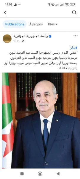 أمضى، اليوم الخميس، رئيس الجمهورية الجزائرية عبد المجيد تبون، مرسوما رئاسيا ينهي بموجبه مهام نذير العرباوي، بصفته وزيرا أول، وقرّر تعيين سيفي غريب وزيرا أول بالنيابة، خلفه له.