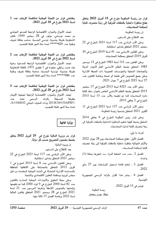 تضمن الرائدالرسمي الأخير الصادر بتاريخ اليوم الجمعة قرارات للجنة الوطنية […] قراءة المزيد تضمن الرائدالرسمي الأخير الصادر بتاريخ اليوم الجمعة قرارات للجنة الوطنية لمكافحة اﻹرهاب تتعلق بتجميد أموال وموارد اقتصادية. ومن بين القرارات المذكورة قرار يقضي بتجميد الأموال الراجعة لجمعية الايمان بطبرقة.
