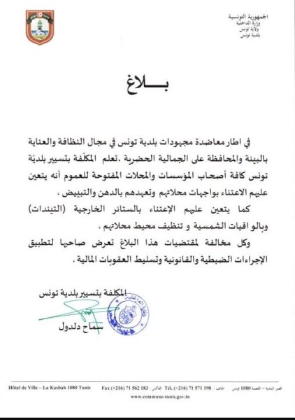 دعت المكلفة بتسيير بلدية تونس، سماح دلدول، جميع أصحاب المؤسسات والمحلات المفتوحة للعموم إلى الاعتناء بواجهات محلاتهم، دهنها، والعناية بالستائر الخارجية (التيندات) والواقيات الشمسية، وتنظيف محيط محلاتهم.