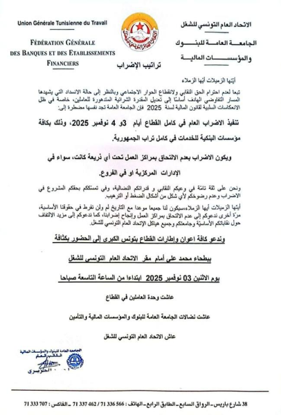 أمدنا الكاتب العام للجامعة العامة للبنوك والمؤسسات المالية أحمد الجزيري اليوم الخميس 30 أكتوبر 2025 برقية تراتيب الاضراب المزمع تنفيذه يومي 3 و4 نوفمبر 2025.
