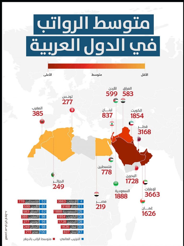 وفي ما يلي إنفوغراف يظهر متوسط الرواتب في الدول العربية: