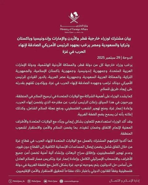 وأكدوا استعدادهم للتعاون بشكل إيجابي وبنّاء مع أميركا والأطراف المعنية لإتمام الاتفاق وضمان تنفيذه، بما يضمن السلام والأمن والاستقرار لشعوب المنطقة، مشددين على التزامهم المشترك بالعمل مع أميركا لإنهاء الحرب في قطاع غزة باتفاق شامل يضمن إيصال المساعدات الإنسانية الكافية إلى القطاع دون قيود، وعدم تهجير الفلسطينيين، وإطلاق سراح الرهائن، وإنشاء آلية أمنية تضمن أمن جميع الأطراف، والانسحاب الإسرائيلي الكامل، وإعادة إعمار غزة، وتكريس مسار للسلام العادل على أساس حل الدولتين، يتم بموجبه توحيد غزة بشكل كامل مع الضفة الغربية في دولة فلسطينية وفقًا للقانون الدولي باعتبار ذلك مفتاحًا لتحقيق الاستقرار والأمن الإقليميين.