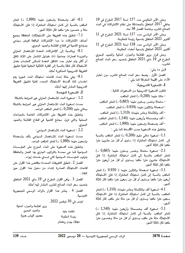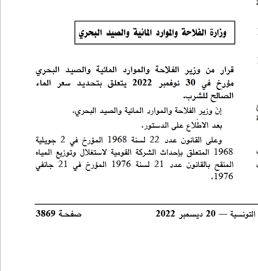 صدر بالرائد الرسمي للجمهورية التونسية في عدده الأخير، أنه تقرّر تعديل تسعيرة الماء الصالح للشرب، وذلك بقرار من وزير الفلاحة والصيد البحري والموارد المائية. وتم ضبط سعر الماء دون اعتبار الأداء على القيمة المضافة كما يلي: