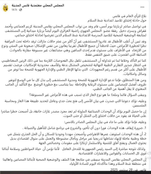 وطنية: أفاد المجلس المحلي بقابس المدينة في بلاغ أن النواب كريم الجماعي وأحمد قفراش ويسرى دخيل رفقة عضو المجلس الجهوي راضية الغرائري أدوا اليوم زيارة ميدانية إلى المستشفى لمتابعة الوضعية الصحية لتلاميذ مدرسة وإعدادية شط السلام الذين تعرضوا لحادثة اختناق جماعي