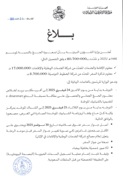 وطنية: أعلنت وزارة الشؤون الدينية أن تسعيرة الحج بالنسبة لموسم 1446 هجري 2025 ميلادي ححدت بـ20.700.000