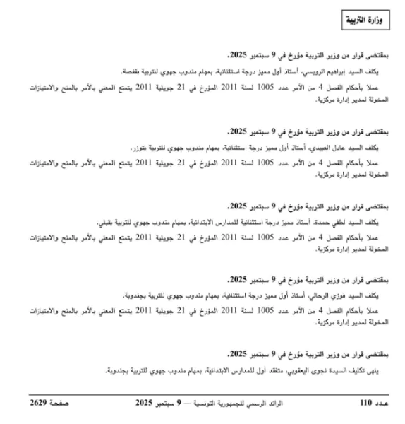 صدر بالعدد الأخير للرائد الرسمي للجمهورية التونسية قرارات من وزير التربية تتعلق بتسميات جديدة على رأس 4 مندوبيات جهوية للتربية وهي قفصة وتوزر وقبلي وجندوبة.