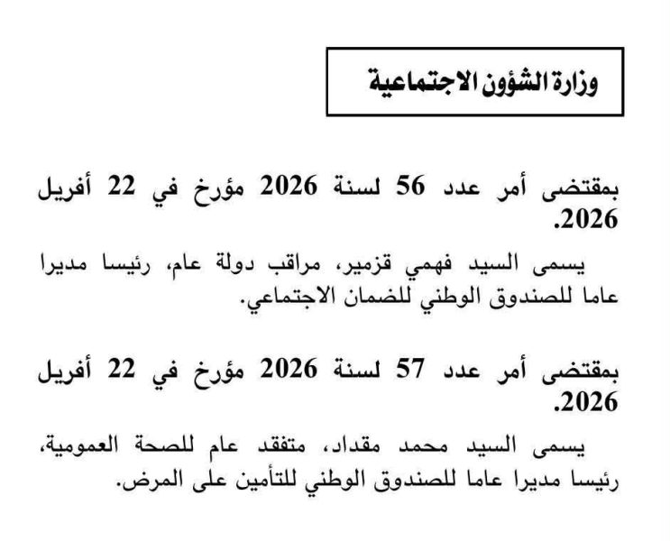 صدر بالرائد الرسمي للجمهورية التونسية أمر عدد 56 لسنة 2026 مؤرخ في 22 أفريل 2026 صادر من وزير الشؤون الاجتماعية ويقضي بتمسية فهمي قزمير مراقب دولة عام رئيس مدير عام الصندوق الوطني للضمان الاجتماعي.