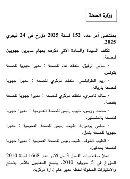 وطنية: وزير الصحة يامر بتعيين مديرين جهويين للصحة في عدد من الولايبات. قراءة المزيد بمقتضى أمر عدد 152 لسنة 2025 مورخ في 24 فيفري 2024 وصادر بالرائد الرسمي للجمهورية التونسية، قام وزير الصحة بتسمية مديرين جهويين للصحة في عدد من الولايات وهم الآتي ذكرهم: تونس الآن/ النشرة المسائية ليوم السبت 13 ديسمبر 2025كرة اليد: نتائج مباريات الجولة الـ18كرة الطائرة/ نتائج مفابلات الجولة الـ5المزيد من الأخبار
