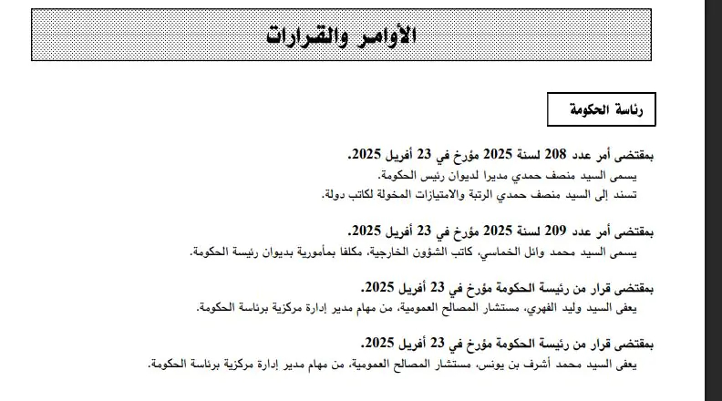 وطنية: أعلنت رئاسة الحكومة عن تسمية منصف حمدي مديرا لديوان رئيس الحكومة بمقتضى أمر عدد 208 لسنة 2025 مؤرخ في 23 أفريل 2025 قراءة المزيد أعلنت رئاسة الحكومة عن تسمية منصف حمدي مديرا لديوان رئيس الحكومة بمقتضى أمر عدد 208 لسنة 2025 مؤرخ في 23 أفريل 2025 وتسند الى منصف حمدي الرتبة والامتيازات المخولة لكاتب دولة وفق الأمر الصادر بالرائد الرسمي عدد 49 لسنة 2025.رئيسة الحكومة تلتقي ممثلي شركات يابانيةسعيّد: توسيع ديوان رجيم معتوق سيحوّل المناطق القاحلة إلى خضراءرئيس الإفريقي يوجه طلبا لرئيسي الجمهورية والحكومةالمزيد من الأخبار