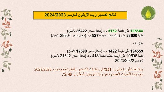 وطنية: أعلن الديوان الوطني للزيت اليوم الجمعة 08 نوفمبر، تسجيل تطور إيجابي في تصدير زيت الزيتون بـ 51% مقارنة بموسم 2022-2023 قراءة المزيد أعلن الديوان الوطني للزيت اليوم الجمعة 08 نوفمبر، تسجيل تطور إيجابي في تصدير زيت الزيتون بـ 51% مقارنة بموسم 2022-2023 مع زيادة الكميات المصدرة من الزيت الزيتون المعلب بـ 46%.ديوان الزيت: قفزة استثنائية في عائدات تصدير زيت الزيتونالمزيد من الأخبار