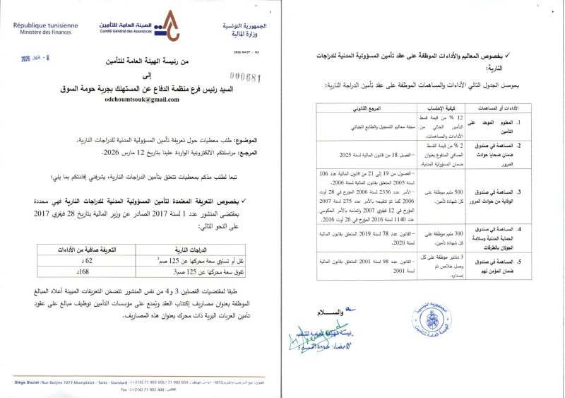 تم ضبط تعريفة تأمين المسؤولية المدنية للدراجات النارية وفق سعة المحرك، حيث حُددت بـ74,480 دينارًا للدراجات الصغيرة والمتوسطة (مثل السكوتر والفيسبا والفورزا وغيرها).