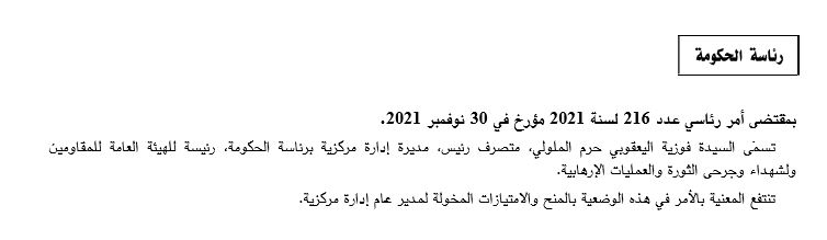 تضمن الرائد الرسمي الأخيرالصادربتاريخ اليوم الجمعة قرارا من رئيسة الحكومة نجلاء بودن بتعيين فوزية اليعقوبي حرم الملولي، متصرف رئيس، مديرة إدارة مركزية برئاسة الحكومة، رئيسة للهيئة العامة للمقاومين ولشهداء وجرحى الثورة والعمليات اﻹرهابية.