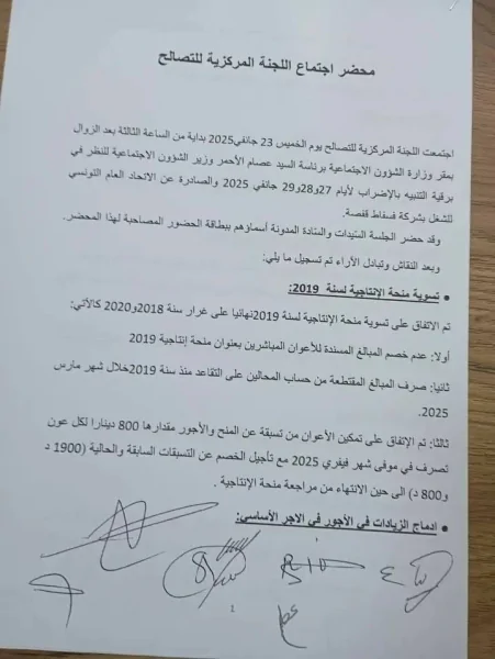 وعلى هذا الأساس قرر الطرف النقابي الغاء الاضراب المقرر أيام 27 و 28 و 29 جانفي 2025