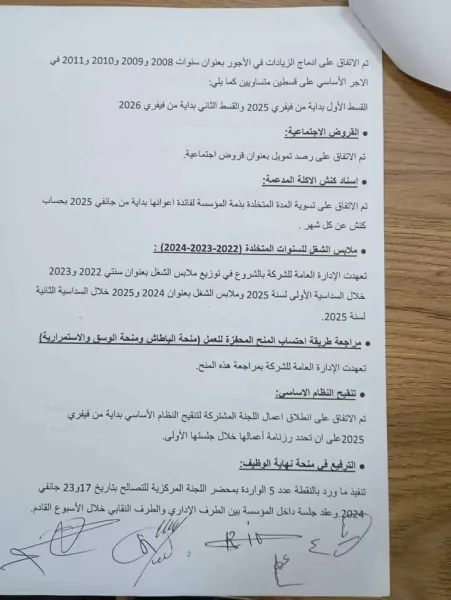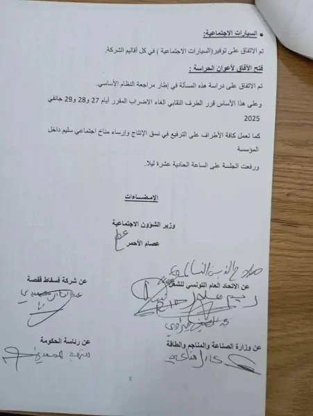 تسوية ملابس الشغل للسنوات المتخلدة (2022-2023-2024) حيث تعهدت الإدارة العامة للشركة بالشروع في توزيع ملابس الشغل بعنوان سنتي 2022 و 2023 خلال السداسية الأولى لسنة 2025 وملابس الشغل بعنوان 2024 و 2025 خلال السداسية الثانية لسنة 2025 و مراجعة طريقة احتساب المنح المحفزة للعمل منحة الياطاش ومنحة الوسق والاستمرارية