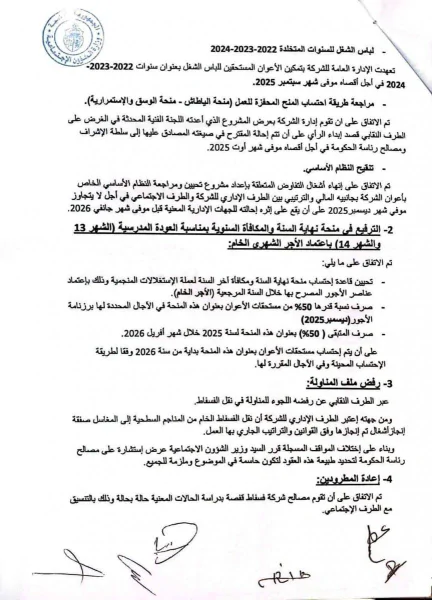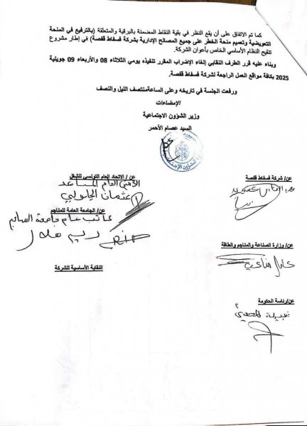 وجاء إلغاء الإضراب بعد الاتفاق على عدد من المطالب النقابية إثر جلسة صلحية عقدتها اللّجنة المركزية للتّصالح، أمس السبت، بمقر الوزارة، بحضور وزير الشؤون الاجتماعية عصام الأحمر وممثلين عن الشركة وممثلين عن الجامعة العامة للمناجم التابعة للاتحاد العام التونسي للشغل.