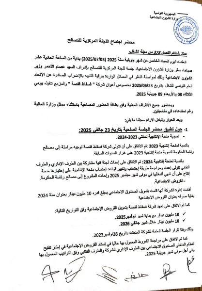 أعلنت وزارة الشؤون الاجتماعية في بلاغ لها على صفحتها الرسمية عن إلغاء الإضراب الذي كان مقرّرا تنفيذه من قبل أعوان شركة فسفاط قفصة يومي 08 و09 جويلية الجاري.